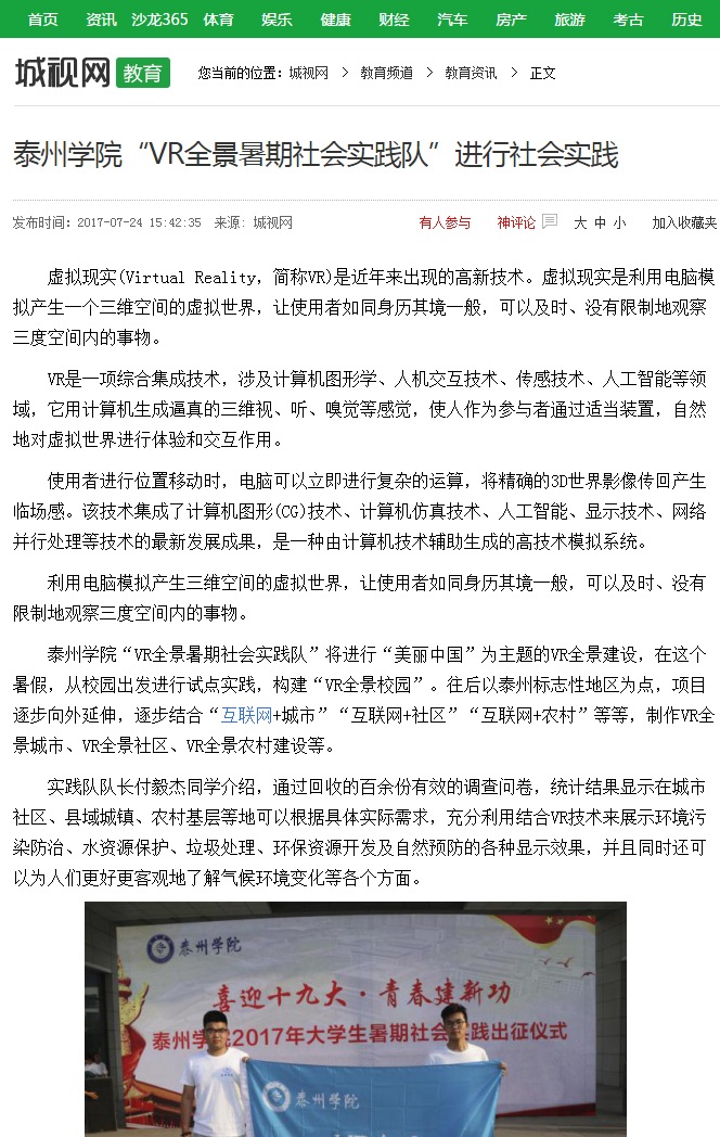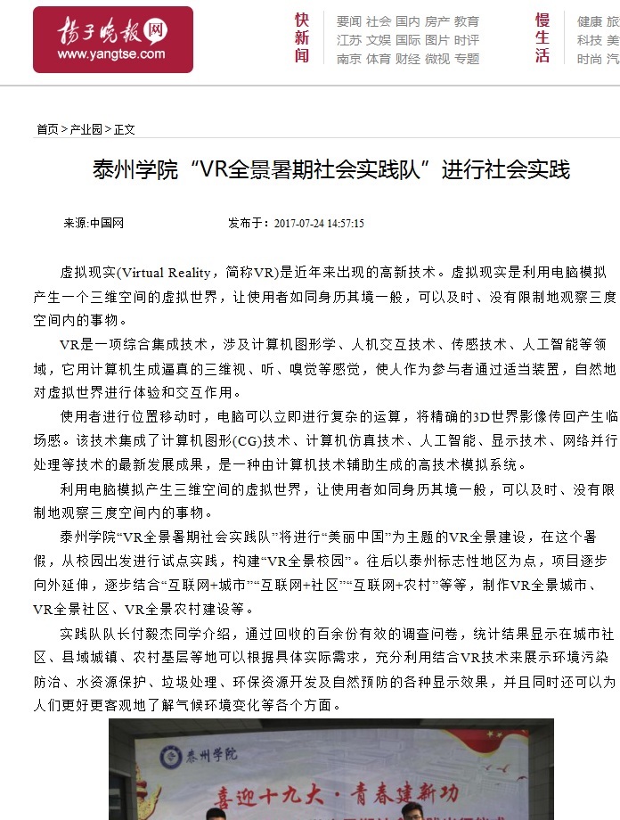 必威西汉姆联“VR全景暑期社会实践队”将进行“美丽中国”为主题的VR全景建设,在这个暑假,从校园出发进行试点实践,构建“VR全景校园”。往后以泰州标志性地区为点,项目逐步向外延伸,逐步结合“互联网+城市”“互联网+社区”“互联网+农村”等等,制作VR全景城市、VR全景社区、VR全景农村建设等。