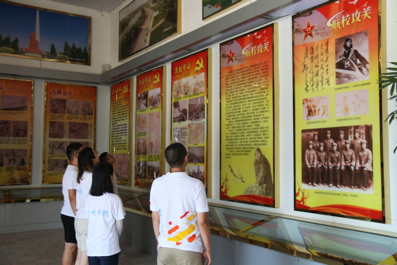 第二站参观调研方城县杜凤瑞烈士纪念馆,杜凤瑞烈士生前的功勋战绩卓著,1958年10月10日,六架美蒋飞机再次犯扰大陆,杜凤瑞和他的战友们依令驾战鹰阻敌,连续击落两架战机后,由于飞机受创,在跳伞过程中被敌机击中,壮烈牺牲。纪念馆内有杜凤瑞烈士塑像和烈士生前驾驶与敌机作战的同型号歼五型歼击机一架。团队成员们满怀敬意的瞻仰烈士塑像,缅怀这位空军战斗英雄。