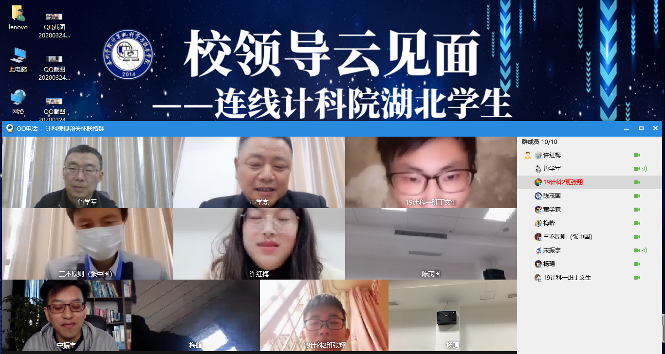 连线中,目前滞留在湖北省黄冈市19计科1班丁文生同学和湖北省孝感市19计科2班张翔同学分别向大家报告了身体状况、生活状况、学习状况、思想动态、当地疫情情况等,两位同学均表示家人和自己都很安全,请领导和老师们放心。