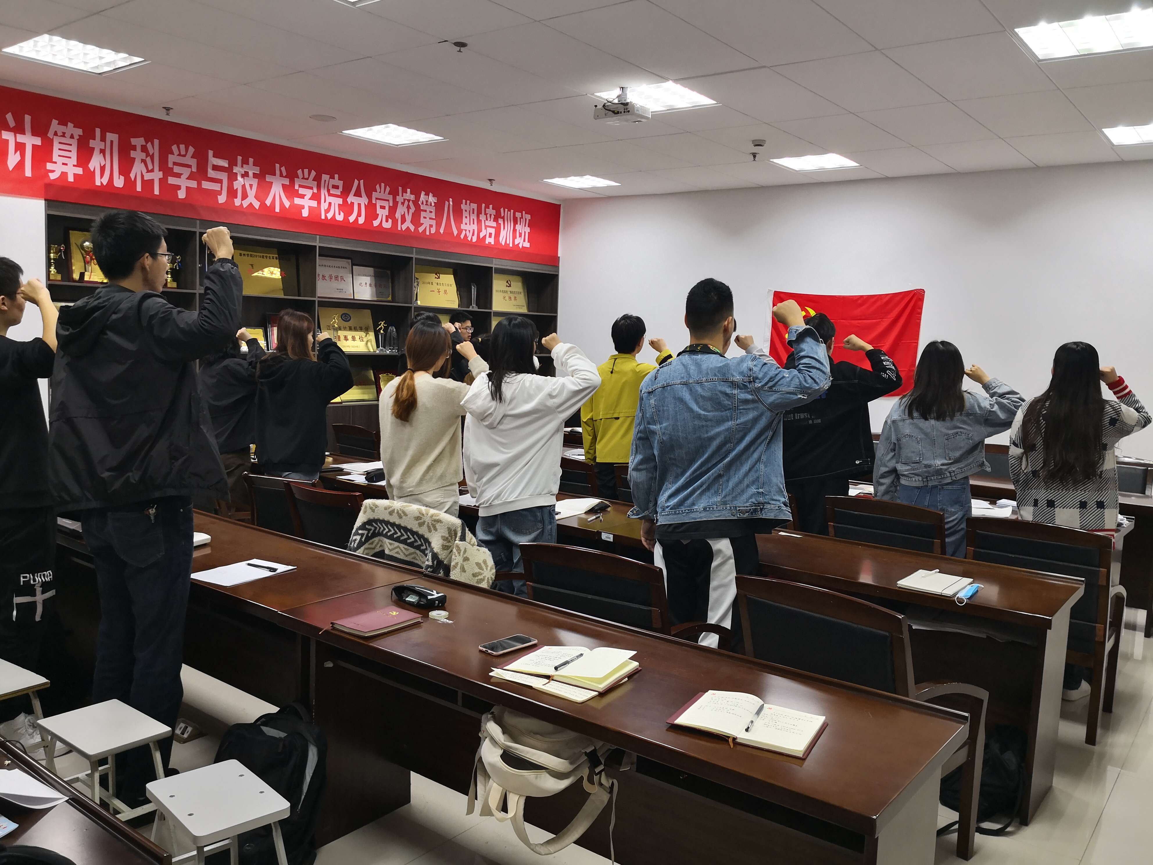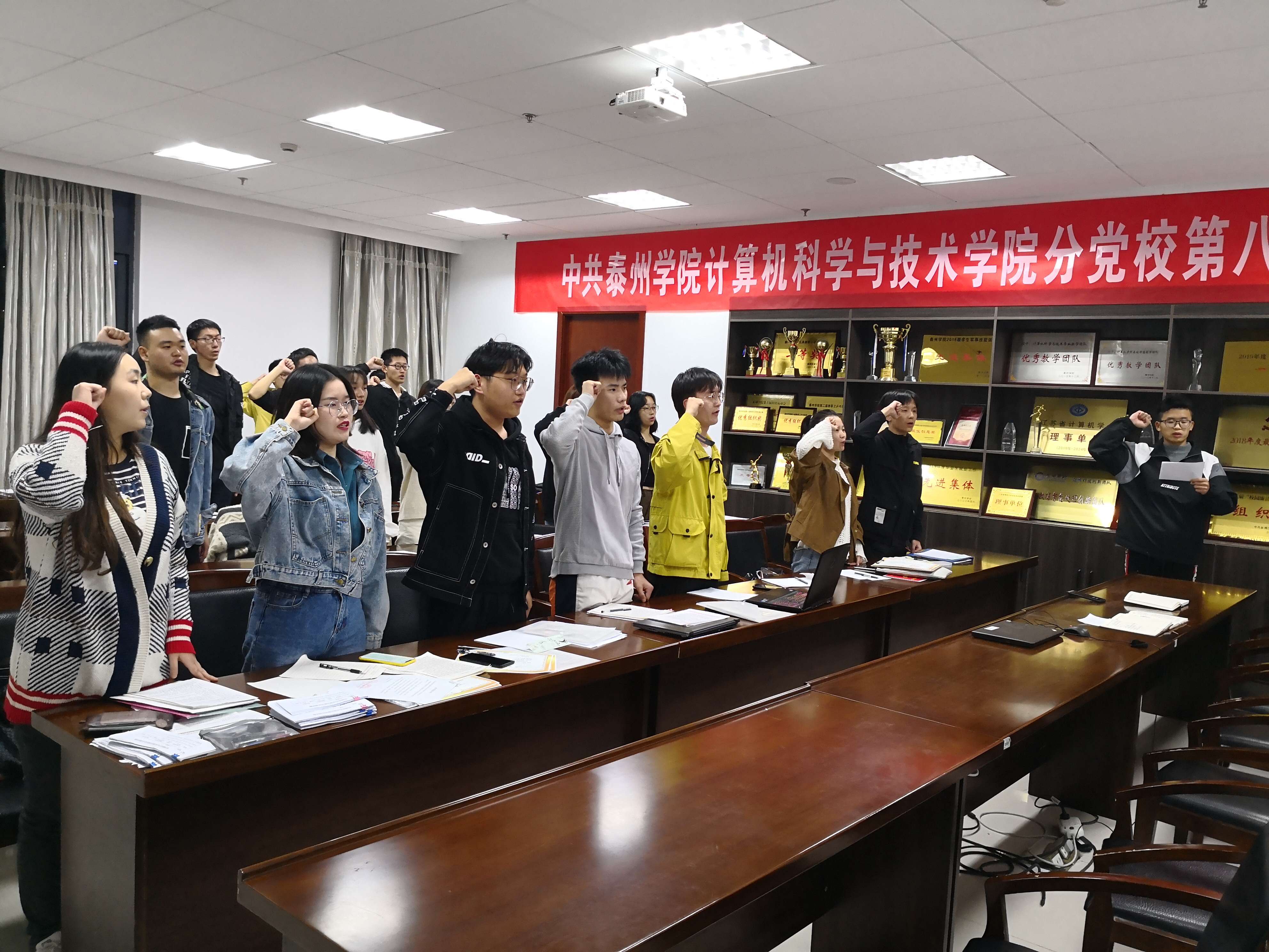 会议宣布后,预备党员同志们,分别面对党旗进行庄严宣誓,也向大会表达了自身的想法与决心,不忘初心跟党走,在今后的学习工作中,加强理论学习、坚定目标、努力改正现有不足,严格要求自己,在同学们中间树立起榜样先锋模范作用。