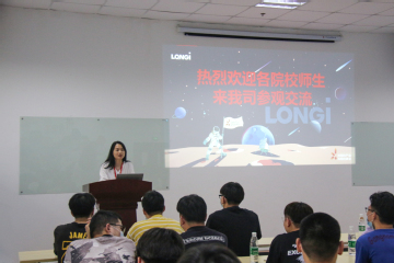 计科院师生队伍首先到达了位于海陵工业园区的泰州隆基乐叶光伏科技公司,讲解员在技术展厅向同学们展示了公司的太阳能光伏技术。座谈会上,公司人事部门钱经理详细介绍了公司的发展前景、福利待遇、企业文化、招聘信息等内容。