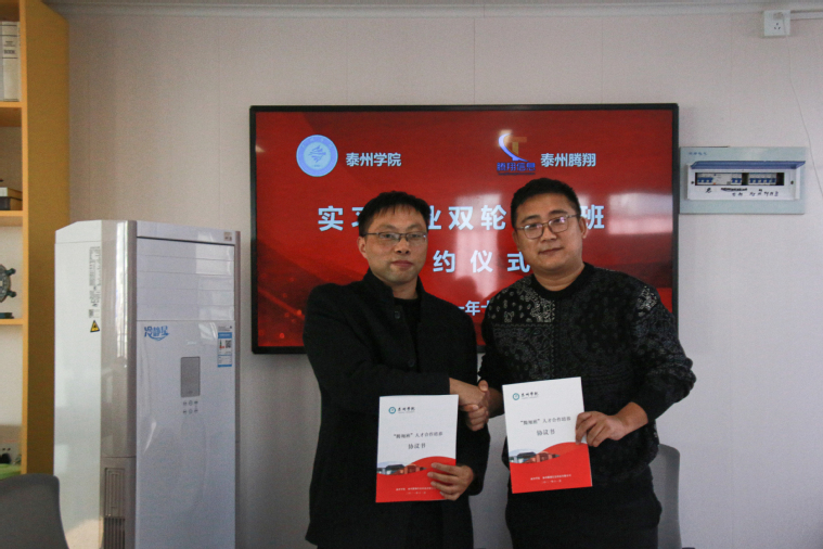 泰州腾翔信息科技有限公司刘俊飞总经理向大家介绍了公司概况,校方介绍了学校及学院情况,双方就实习就业、课程嵌入等方面的合作进行了深入探讨。刘俊飞和教务处副处长彭海静共同签署了“腾翔班”人才合作培养协议书。