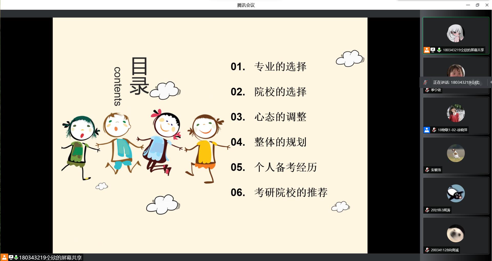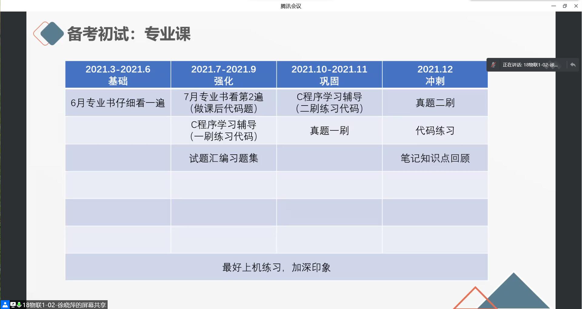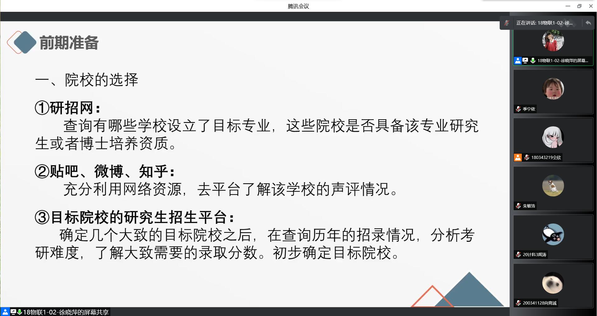 “未雨绸缪,考研交流。”徐晓萍同学就考研前期准备、考研备考初试、考研复试、考研调剂四个方面与大家分享考研经验与心得。她就考研的意义、如何选择适合自己的学校以及各个阶段如何复习等进行非常全面地介绍,以自己为例,生动形象地描述考研各阶段如何准备、复习、应试等等。