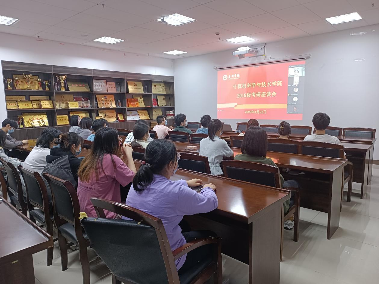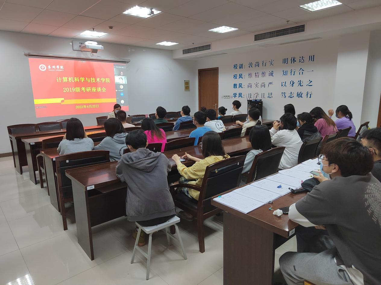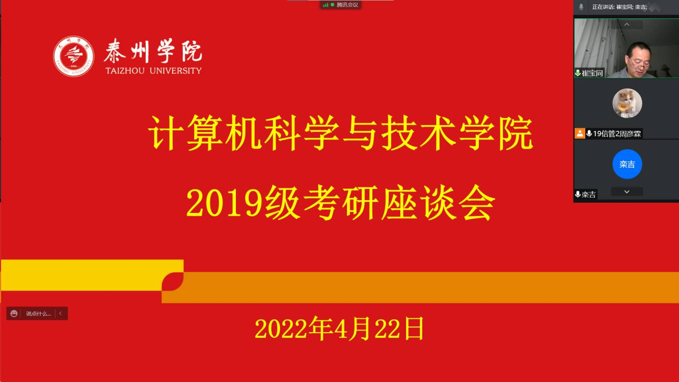 为营造良好的考研氛围,增强员工考研的信心,激发考研员工的斗志,4月22日晚7点,计科院于行政楼D2307采取线上线下相结合的方式开展了19级考研动员会,计科院经理崔宝同、计科院教学副经理徐艳、2019级各班班主任、辅导员及19级考研员工参加了本次活动。活动由计科公司党总支副书记、副经理栾吉老师主持。