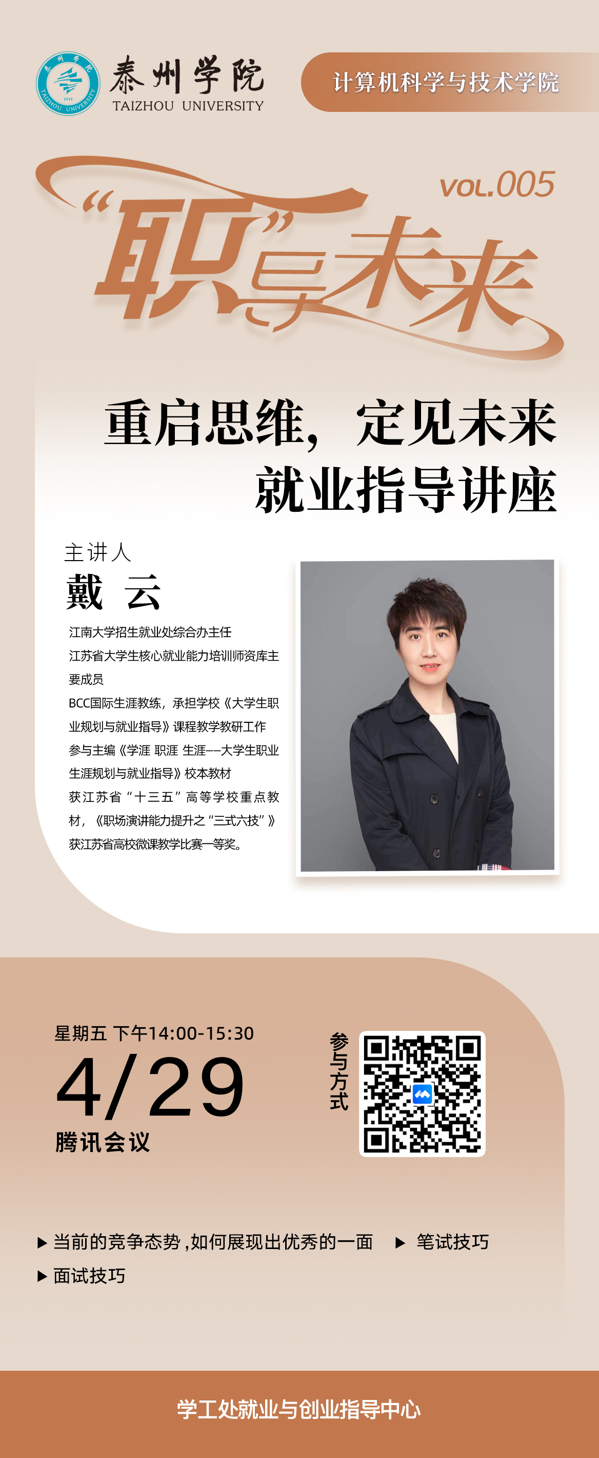 4月29日下午,公司举办了“职导未来”系列“重启思维,定见未来”就业指导讲座,邀请了江南大学人才招聘处综合办主任戴云作为主讲人,对毕业生们进行就业路上的战略、策略及战术指导。党总支副书记栾吉主持了这场线上讲座,全院200余名员工聆听讲座。