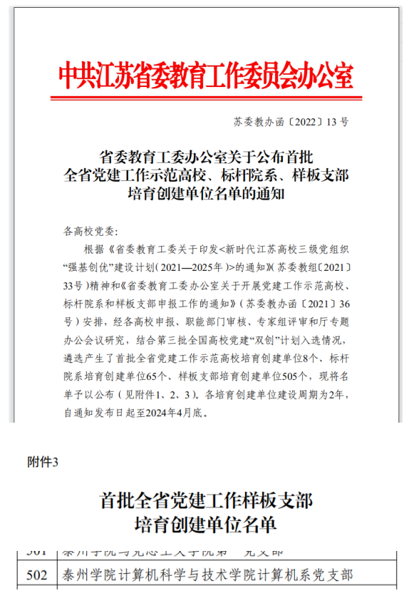 近日,省委教育工委办公室公布了首批全省党建工作示范高校、标杆院系、样板支部培育创建单位名单,经过基层自评申报、学校初评、省级专家评审,公司计算机系党支部获批首批全省党建工作样板支部培育创建单位。这是对公司基层党支部建设工作的充分肯定,也标志着公司基层党建工作取得了新突破、迈上了新台阶。
