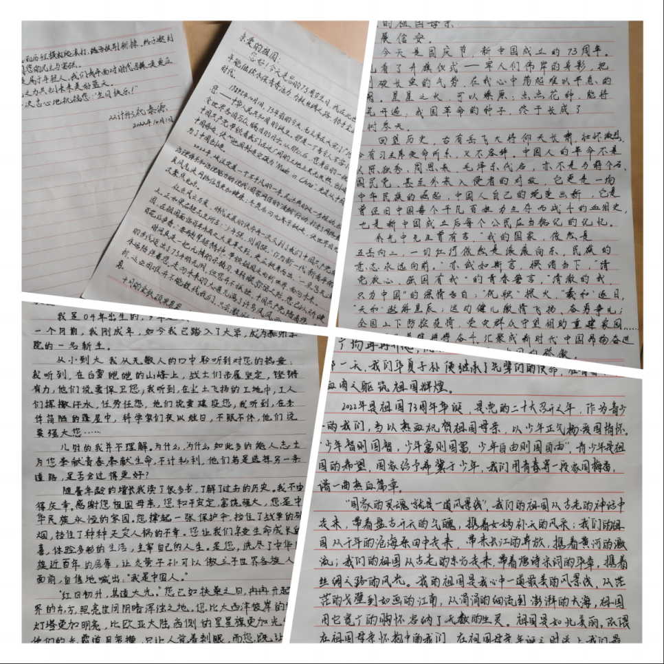 “以青春告白伟大祖国——给祖国母亲的一封信”手写征集活动中,大家用文字和赤诚之心真实有爱地告白祖国,通过“以小见大”的表达形式,歌颂祖国的繁荣富强,人民的幸福生活,抒发了青年员工“生在国旗下,长在春风里,目光所至皆为华夏”的民族自豪感和爱国情怀。活动先后收到征文20余篇,反响热烈。