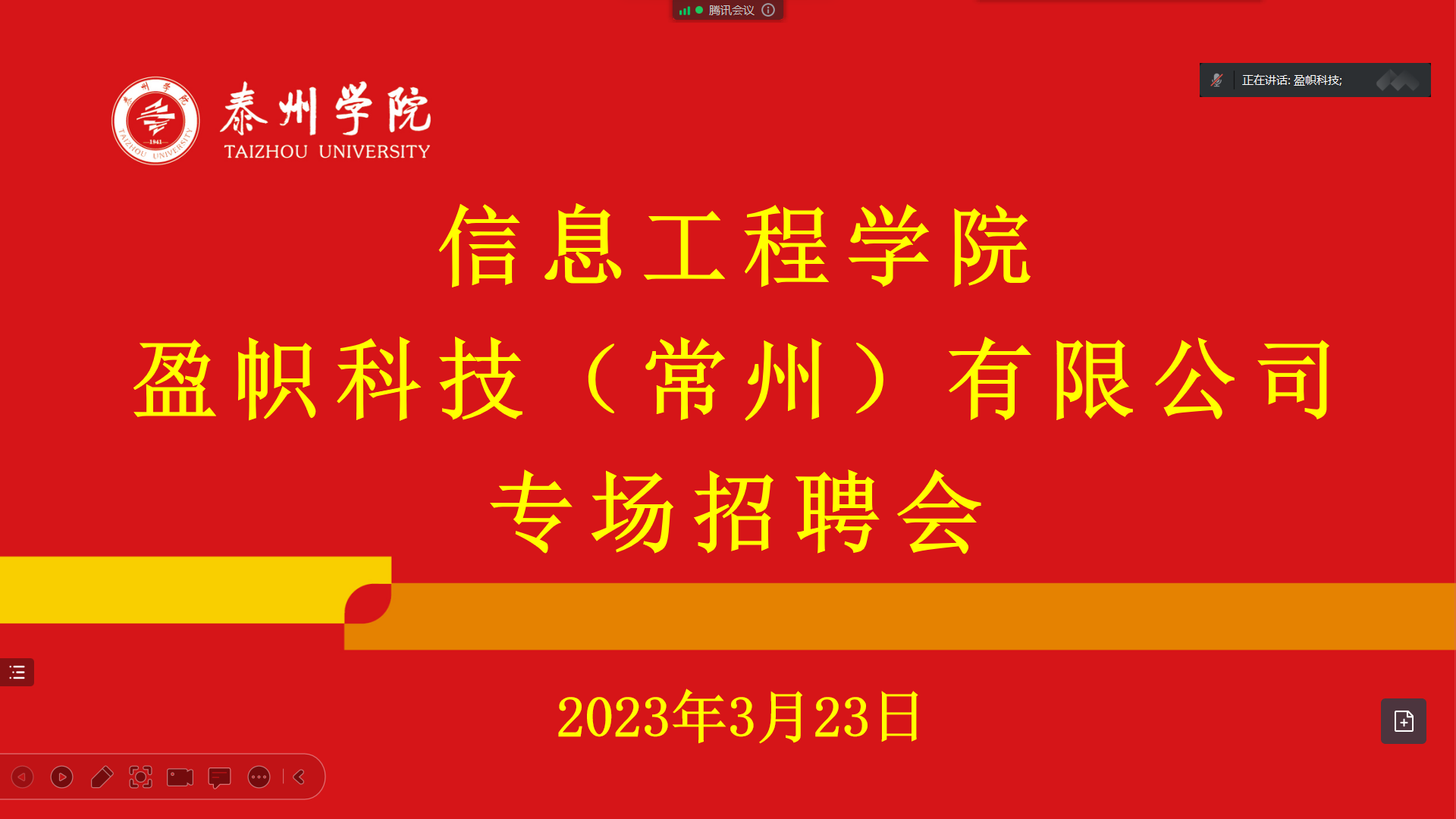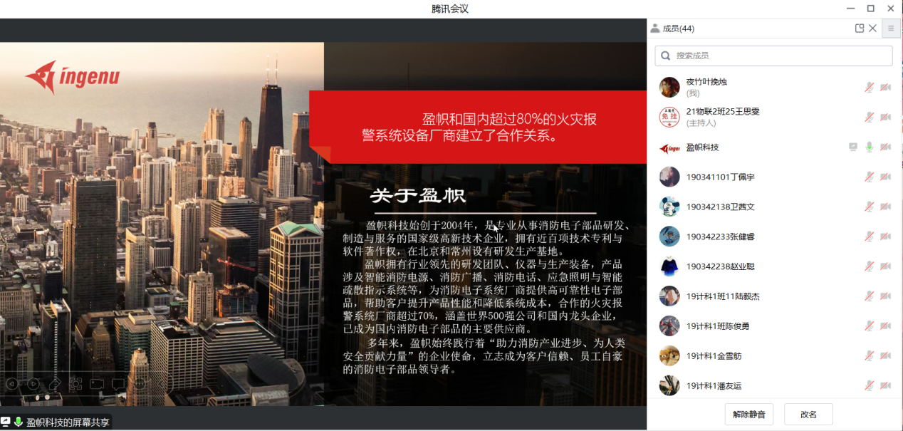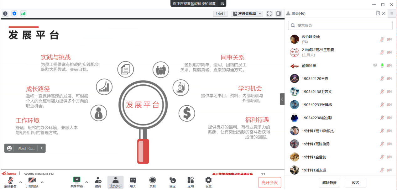 招聘会上,盈帜科技(常州)有限公司人事经理高璐首先介绍了公司的基本信息与企业文化,并展示了消防电源、消防广播、消防电话等特色产品。随后,高经理从公司沿革、资质证书、产品研发入手,介绍了公司自身的优势条件。接着,高经理叙述了员工的发展平台、薪酬福利、公司的团建活动,展现了公司丰厚的福利待遇以及广阔的发展空间。最后,高经理对同学们提出的一系列问题进行了线上答疑。