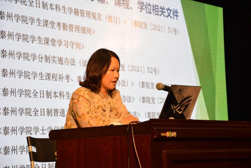 蒋辉芹针对考试要求以及毕业、学位授予条件进行解读。她从学籍管理、学士学位授予等方面带领同学们学习了必威西汉姆联相关教学文件,让同学对学校的政策有了更深入的了解。