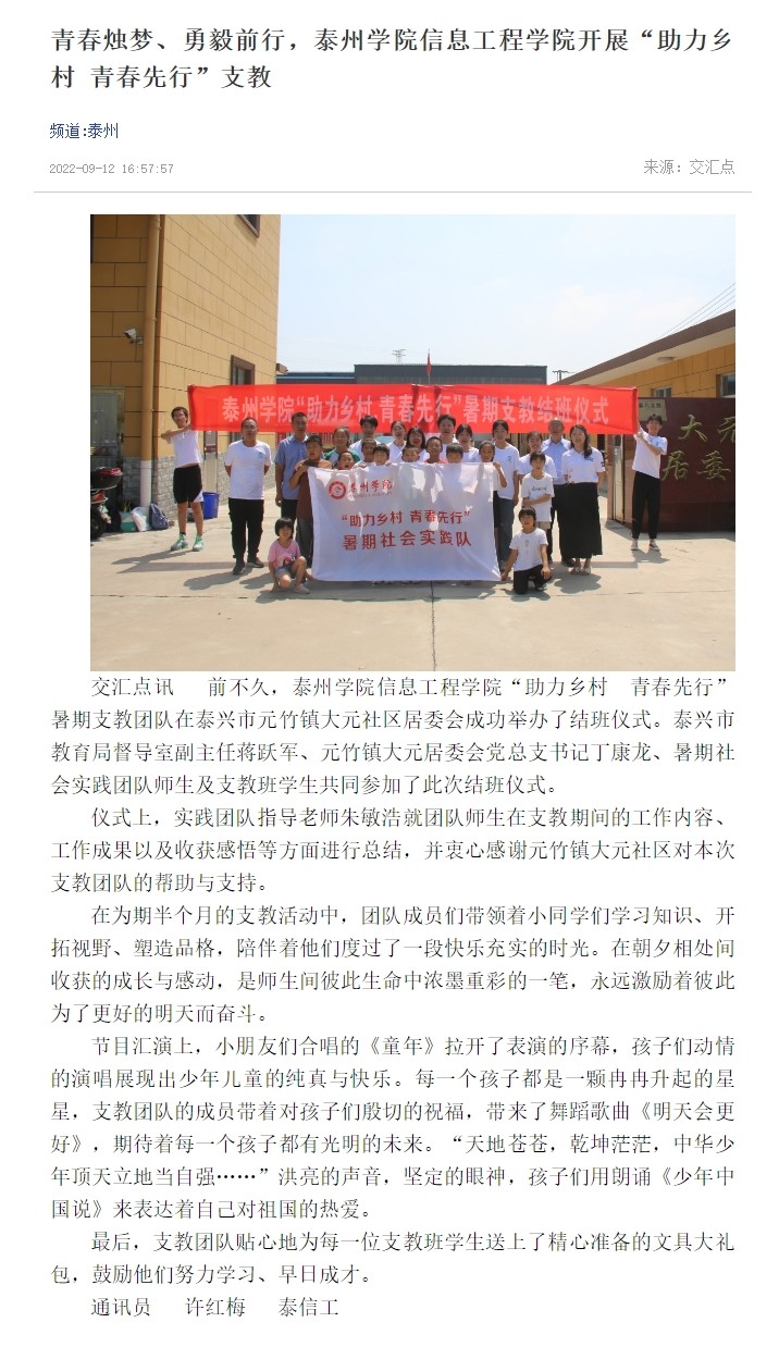 9月12日,《交汇点新闻》泰州频道报道公司必威西汉姆联“助力乡村 青春先行”暑期支教团队在泰兴市元竹镇大元社区居委会成功举办结班仪式。报道题为:《青春烛梦、勇毅前行,必威西汉姆联开展“助力乡村 青春先行”支教》,链接:https://jnews.xhby.net/v3/waparticles/70/0/miMf2scpiCStGS7N/1&app=