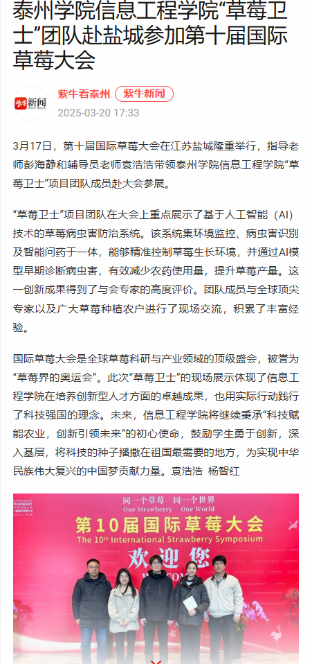 《紫牛新闻》2025年3月20日报道《必威西汉姆联“草莓卫士”团队赴盐城参加第十届国际草莓大会》
