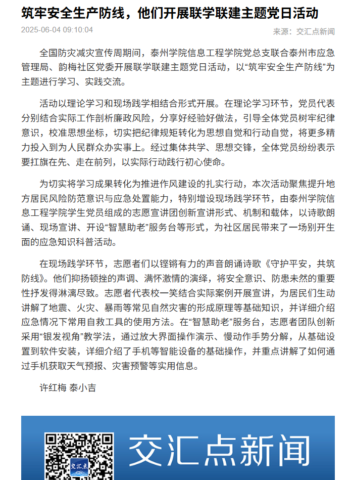 《交汇点新闻》2025年6月4日报道《筑牢安全生产防线,他们开展联学联建主题党日活动》